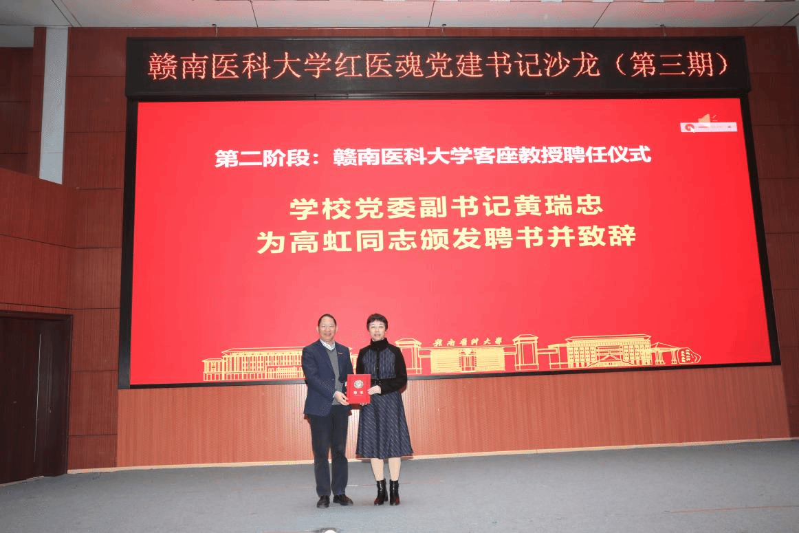第二阶段,举行了聘任仪式。黄瑞忠代表学校为高虹同志颁发了赣南医科大学客座教授聘书并致辞。他表示,期待以此次聘任为契机,推动学校与复旦大学附属中山医院合作“再升级”,在党建共建、人才培养、学术交流、学科建设等领域深化合作,实现优质医疗资源与高等医学教育资源深度融合,共同为推动赣南地区医疗卫生事业进步、助力健康中国建设作出新的更大贡献。