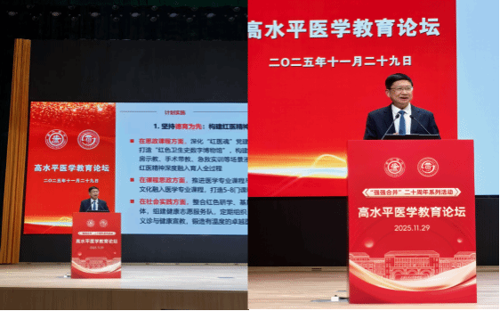 他指出,在教育部大力支持下,我校与上海交通大学医学院开展了深度战略合作,并以培养拔尖创新医学人才为目标,共建临床医学专业(交大医学班)。在社会各界共同关心、支持下,2025年9月,“交大医学班”顺利开班,迈入了正常教学轨迹,并建立了以培养卓越临床医学人才为目标的“五化”培养体系,取得了初步成效。下一步,学校将以此次活动为契机,进一步深化两校合作,始终坚持以红医精神为引领,深化校际协同和医工交叉融合,构建扎根红土地、面向健康中国的卓越医学人才培养范式,将“交大医学班”打造成为红医特色鲜明、临床技能扎实、科研素养突出、综合素质全面的卓越医学人才培养高地,为健康江西和健康中国建设输送大批医德高尚、技术精湛的卓越创新医学人才。