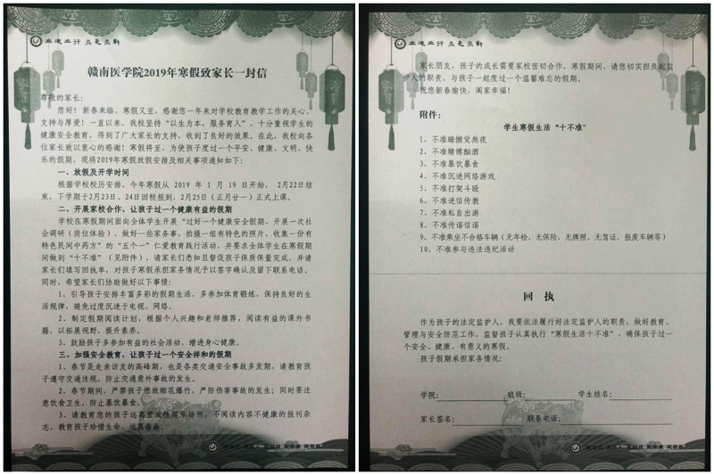 同时该处分别制作了“赣南医学院2019年寒假致家长一封信”和“赣南医学院校园贷风险告知书”等信函,要求全体学生开展“过好一个健康安全假期,开展一次社会调研(岗位体验),做好一些家务事,拍摄一组有特色的照片,收集一份有特色民间中药方”的“五个一”仁爱教育践行活动,以及寒假期间做到 “不准睡懒觉熬夜、不准赌博酗酒、不准暴饮暴食、不准沉迷网络游戏、不准打架斗殴参与黑社会活动、不准迷信传教、不准私自出游、不准传谣信谣、不准乘坐不合格车辆(无年检、无保险、无牌照、无驾证、报废车辆等)、不准参与违法违纪”等“十不准”活动。并请求学生家长积极配合学校工作,督促孩子认真完成学校布置的作业,学生返校后及时上交假期作业和回执单。