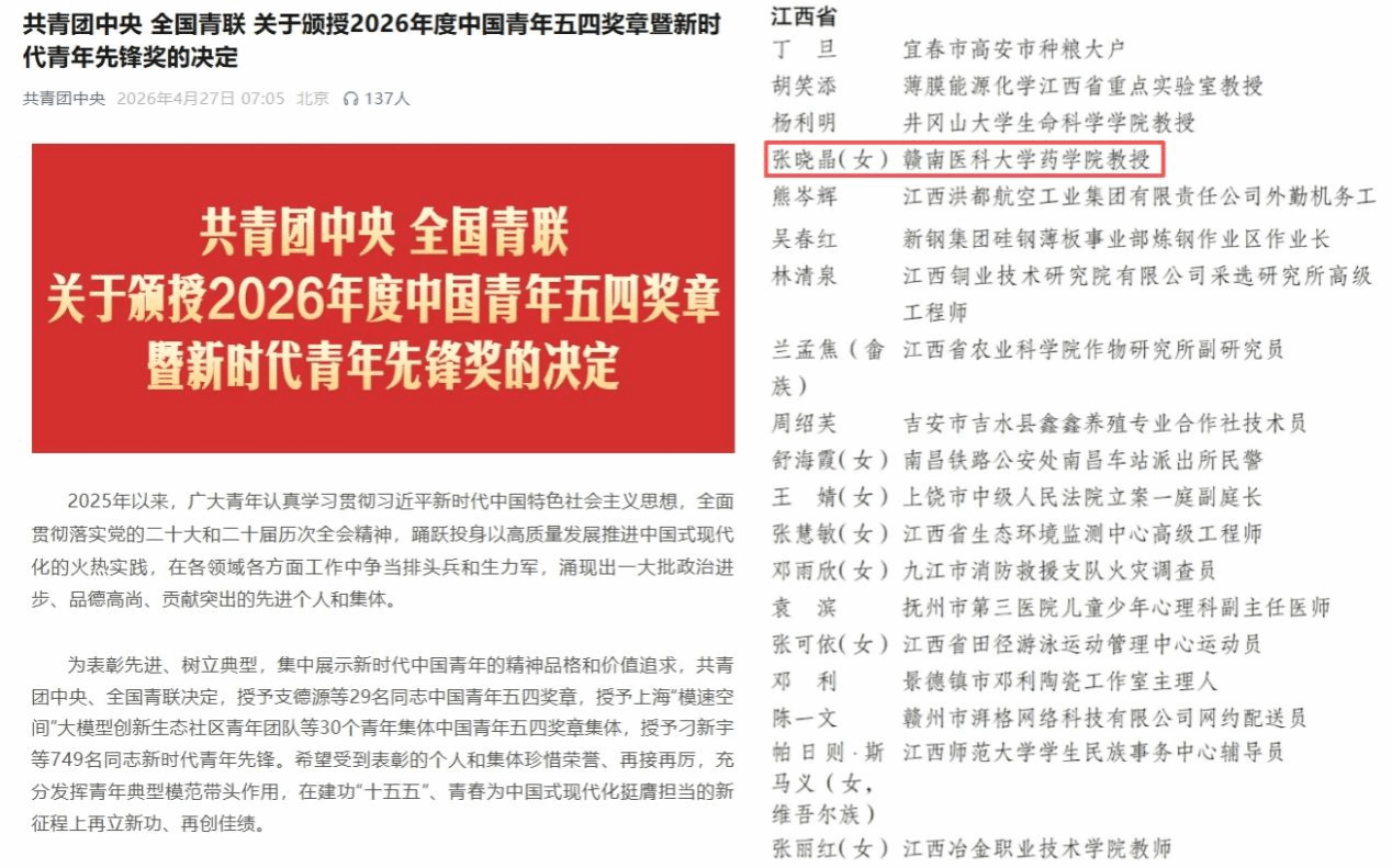 近日,共青团中央、全国青联发布《关于颁授2026年度中国青年五四奖章暨新时代青年先锋奖的决定》,我校药学院副院长张晓晶教授荣获“新时代青年先锋”荣誉称号。