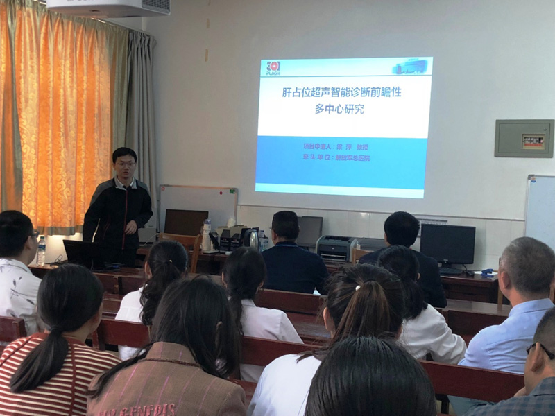 今年4月,我校第一附属医院超声医学科应邀加入由解放军总医院介入超声科主任梁萍教授牵头的“肝占位超声智能诊断前瞻性多中心研究”。为推进该项研究的顺利实施,5月9日梁萍教授委派蔡文佳博士到该院详细介绍研究方案,现场解答研究图像采集的标准及注意事项等问题。