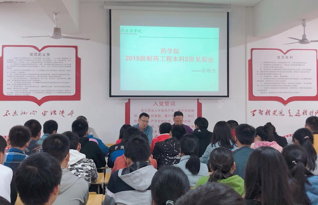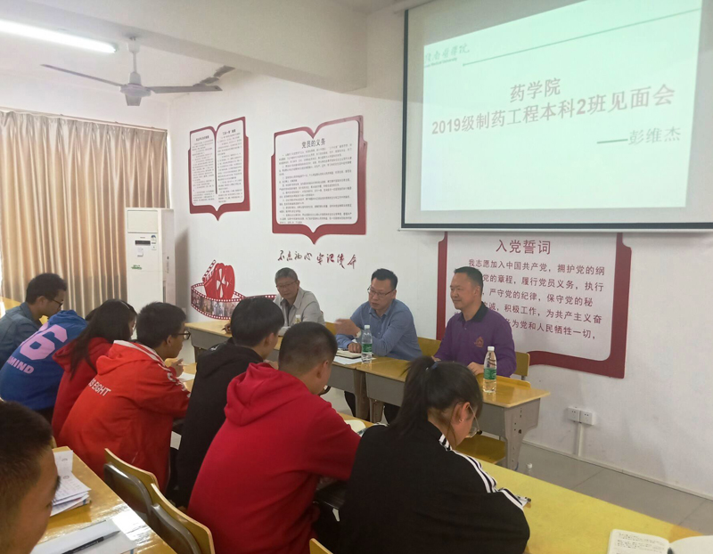 11月8日下午,学校党委委员、副校长彭维杰在黄金校区五六栋党员活动室与2019级制药工程本科2班的同学们见面交流。