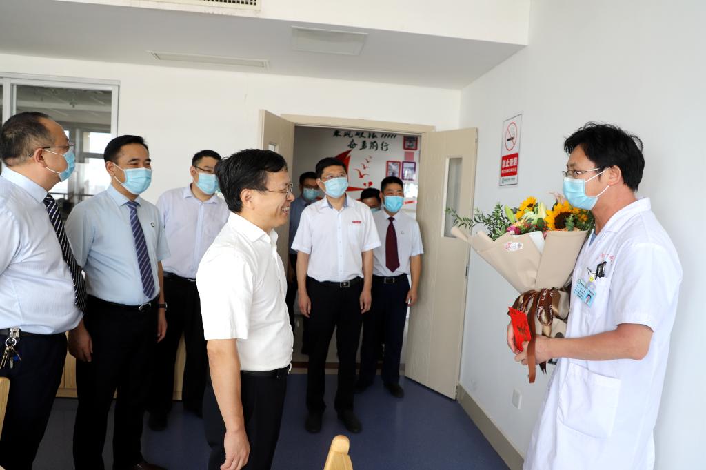 李恭进先后走访慰问了优秀医师代表吕维名、任苓、欧阳松茂、袁小亮、曾祥福,向他们献上鲜花,向他们表示节日的祝贺。在认真听取医院相关同志情况介绍后,李恭进指出,面对今年突如其来的新冠肺炎疫情,一附院广大医务工作者冲锋在前、英勇奋战、精心施治,以实际行动诠释了敬佑生命、救死扶伤、甘于奉献、大爱无疆的崇高精神,展现了赣医人精诚团结的力量,赢得了全社会的尊重,值得大家学习。