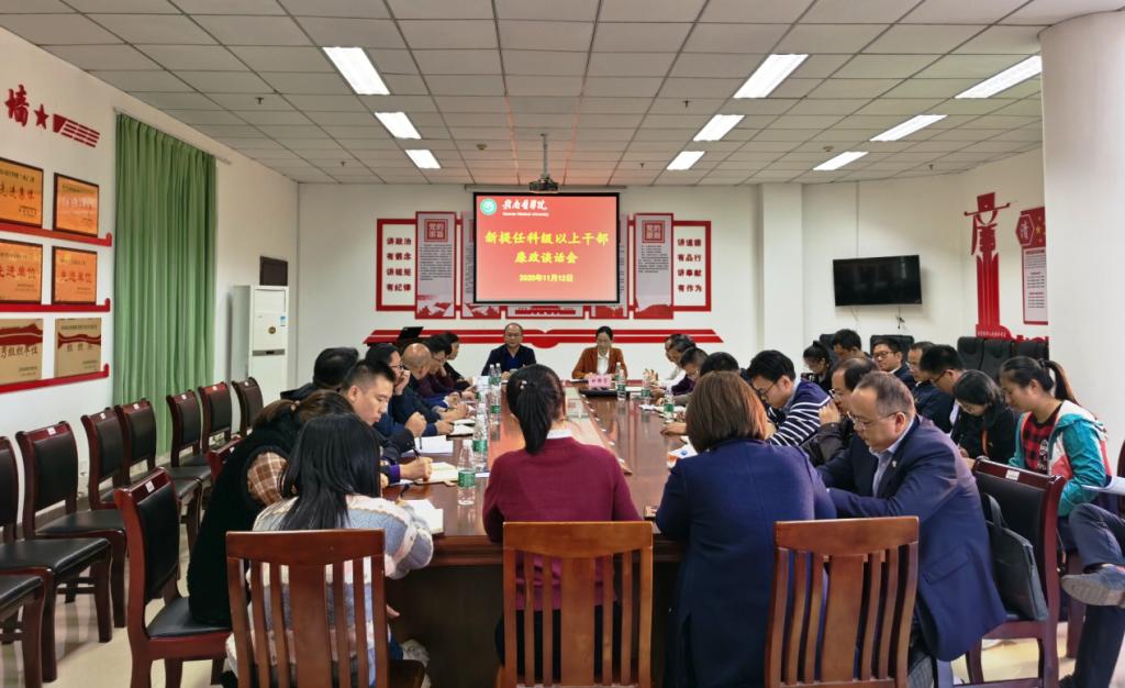 11月12日下午,学校纪委、党委组织部联合召开新提任科级以上干部集体廉政谈话会。学校党委委员、纪委书记肖树辉出席并讲话,学校党委委员、组织部部长甘雅芬主持会议。30名新近提拔的处级、科级干部参加了集体廉政谈话。