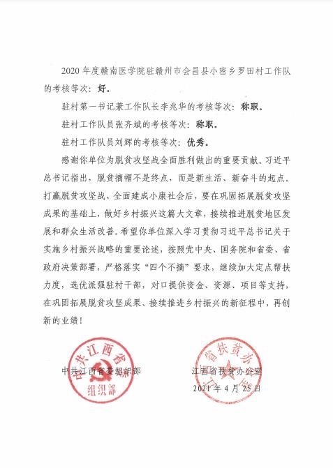 近日,从江西省委组织部、江西省扶贫办公室印发的《关于2020年度省派单位驻村干部和驻村工作队及2018-2020年度省派单位定点帮扶考核结果的函》中获悉,我校在2018-2020 年度定点帮扶单位考核中被评为“好”等次,我校驻赣州市会昌县小密乡罗田村工作队在2020年度考核中被评为“好”等次,我校2020年度驻村工作队员刘辉在考核中被评为“优秀”。