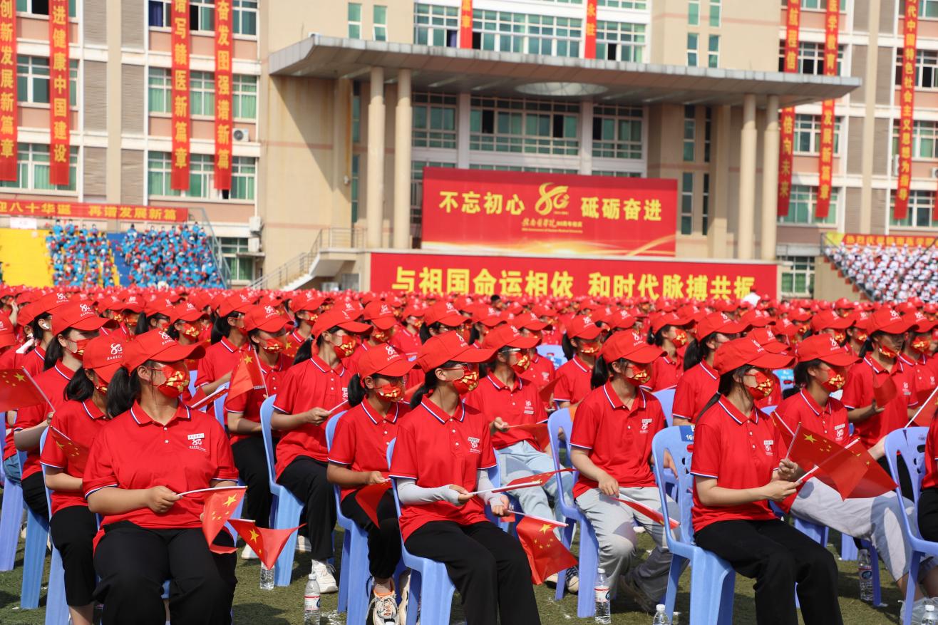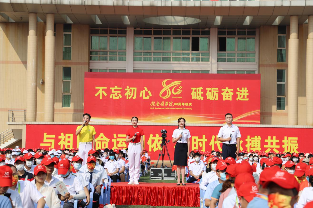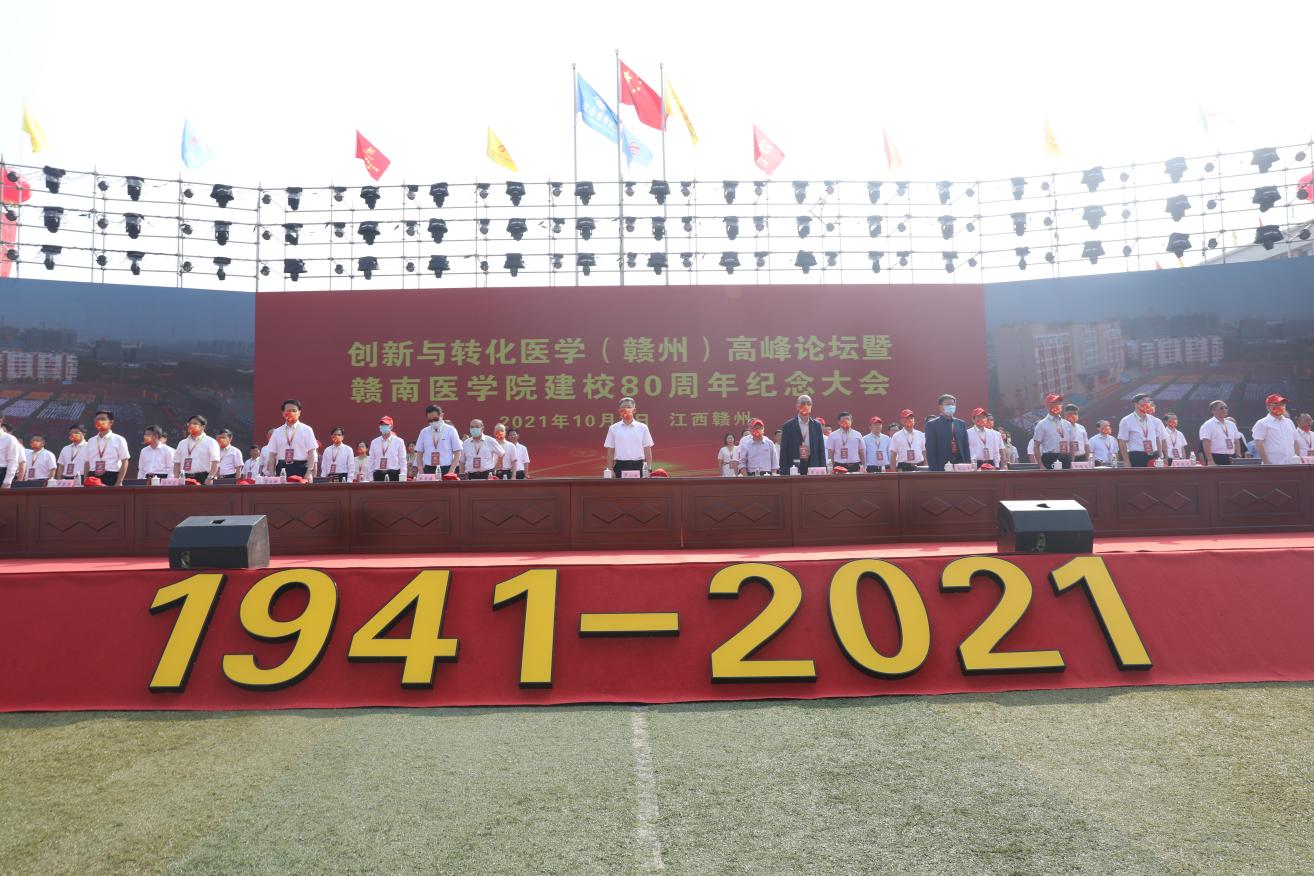 蓝天丽日下,赣南医学院黄金校区运动场花团锦簇,彩旗飘扬,中心舞台“1941-2021”镶金黄色字样格外醒目,“与祖国命运相依 和时代脉搏共振”的巨幅标语昭示着赣南医学院走过的80年不平凡历程。