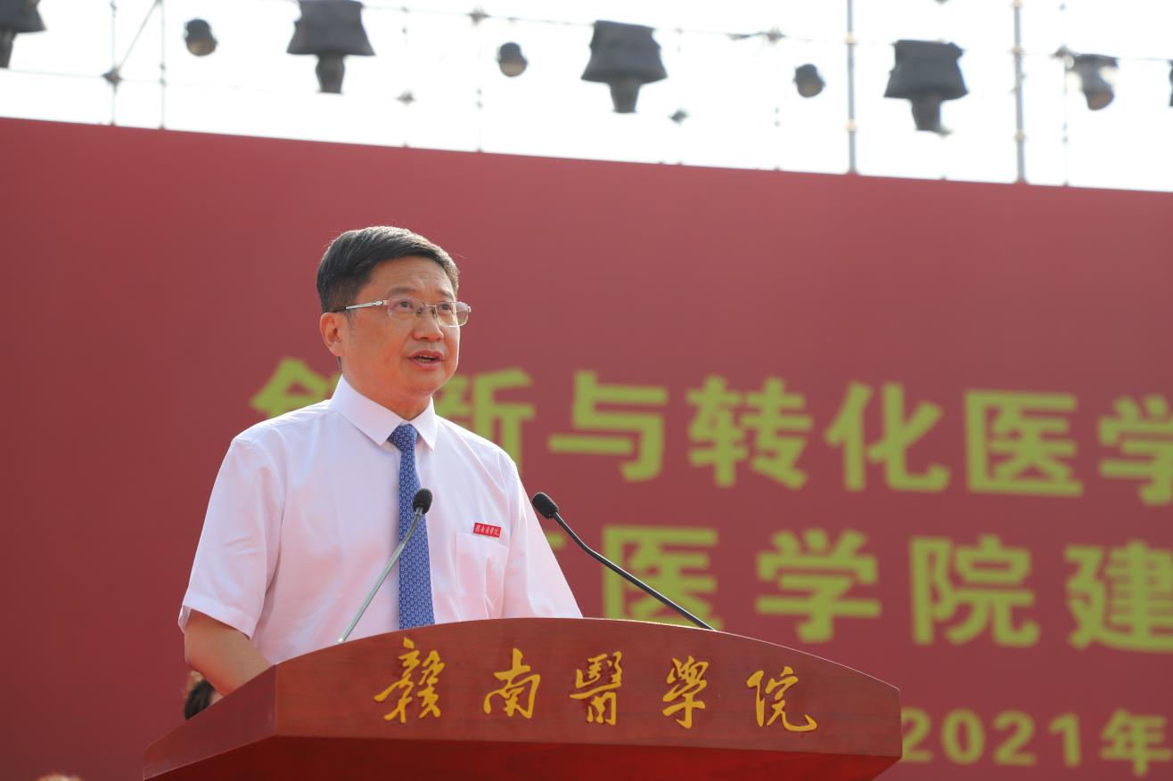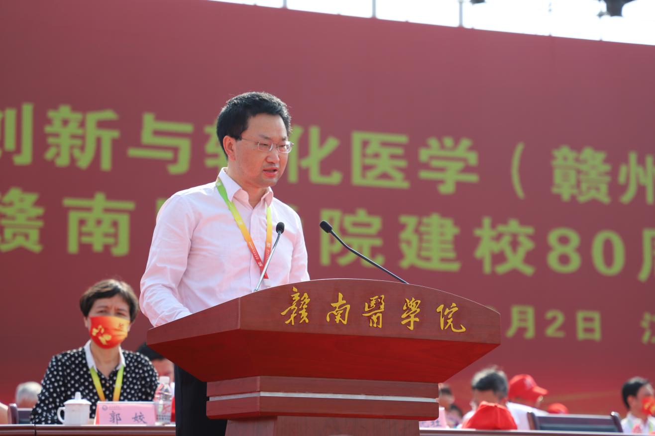 中国医学科学院北京协和医学院党委书记姚建红代表兄弟医科院校致辞。他表示,多年来,赣南医学院和中国医学科学院北京协和医学院在医学教育、科学研究、文化传承、学术交流等多方面深入开展合作,建立起真挚深厚的友谊,共同致力于推动祖国医药卫生事业发展。两校将进一步加强交流合作,努力接续奋斗,共同为我国高等教育事业发展,为国家医疗卫生事业发展,为推进中华民族伟大复兴进程,作出新的更大贡献。