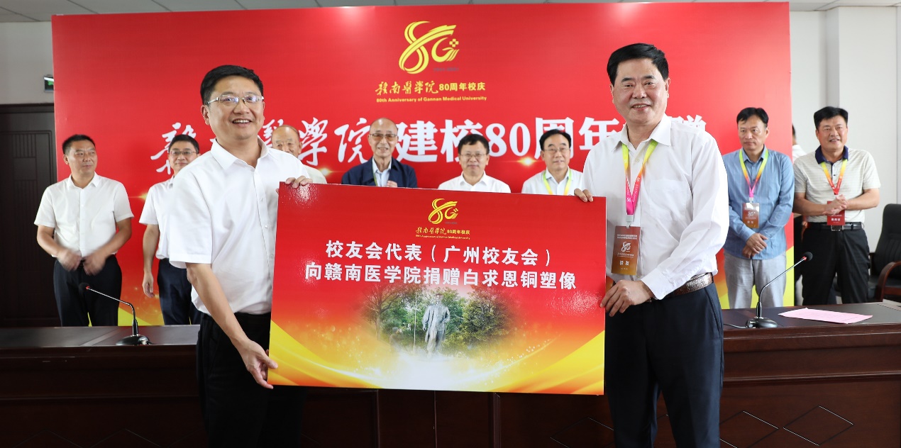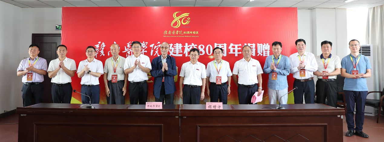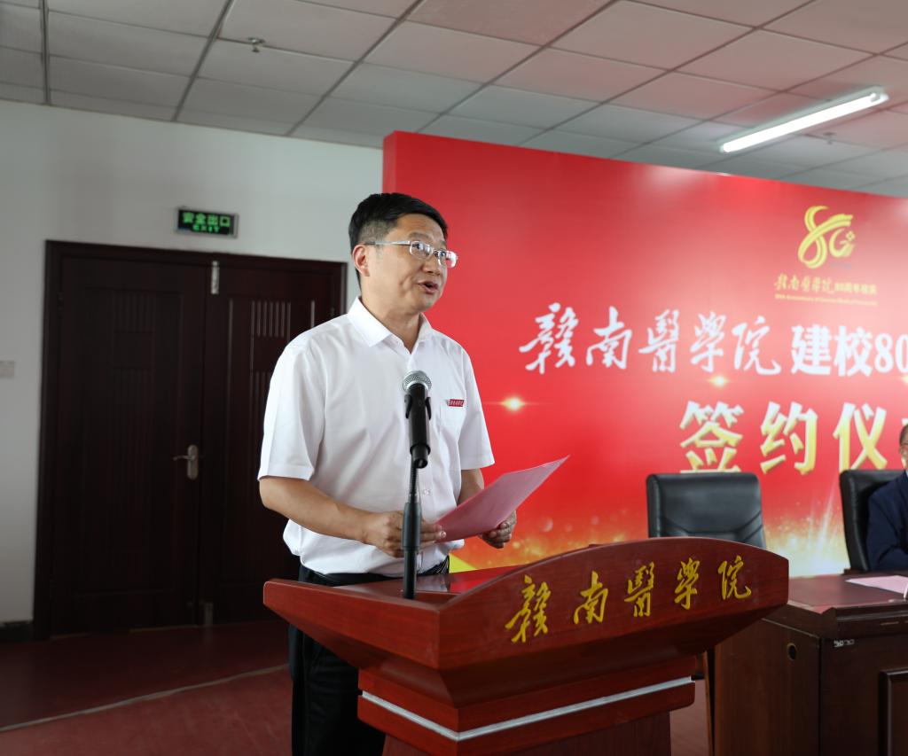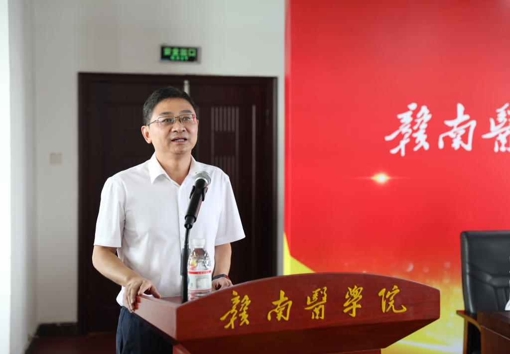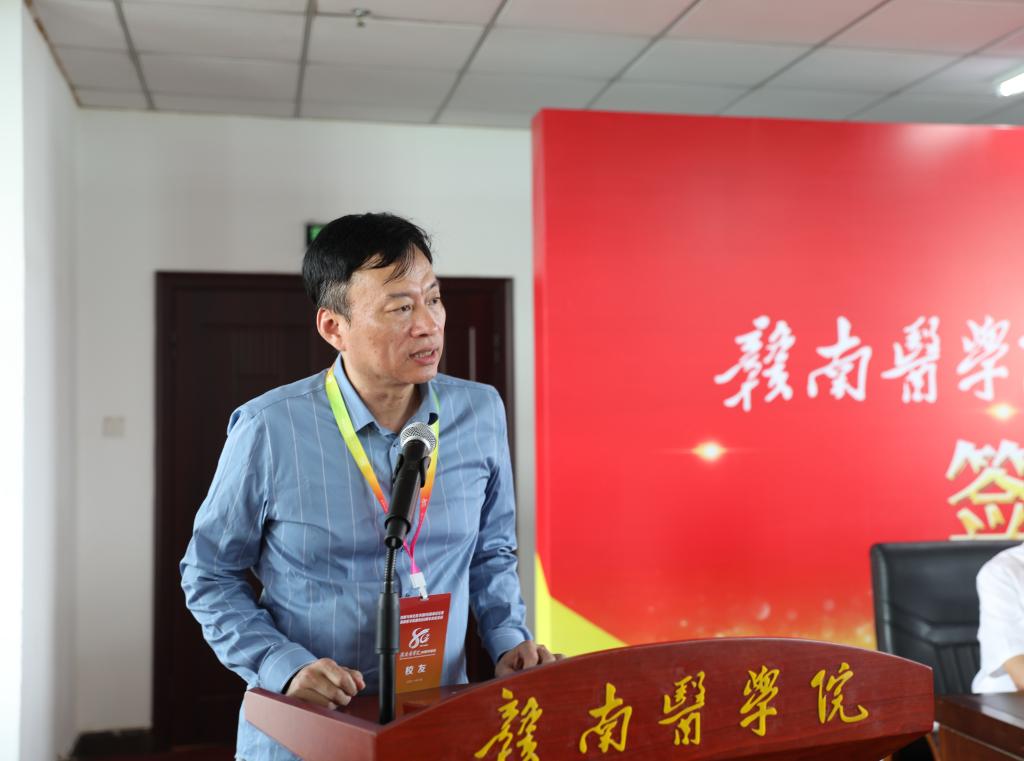 天津康宏投资有限公司王建国,赣州市域校附属医院、教学医院及实习医院代表赖卫国作为捐赠单位代表先后发言。王建国和赖卫国表示,赣南医学院80年来为国家、为社会培育了一批又一批的实用型医学人才,始终为赣南百姓的健康福祉作出贡献,很荣幸能作为企业、校友为学校的建设添砖加瓦,希望赣南医学院初心如磐,奋楫笃行,早日完成更名大学目标。