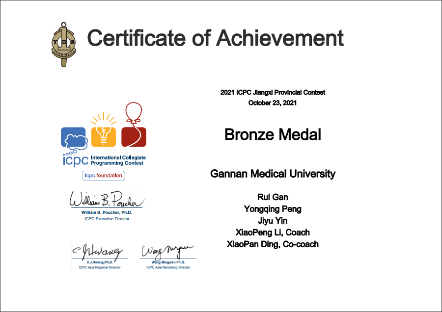 2021年ICPC(International Collegiate Programming Contest)江西省大学生程序设计竞赛10月23日在线上进行了江西赛区的比赛。我校医学信息工程学院参赛队伍荣获铜牌。