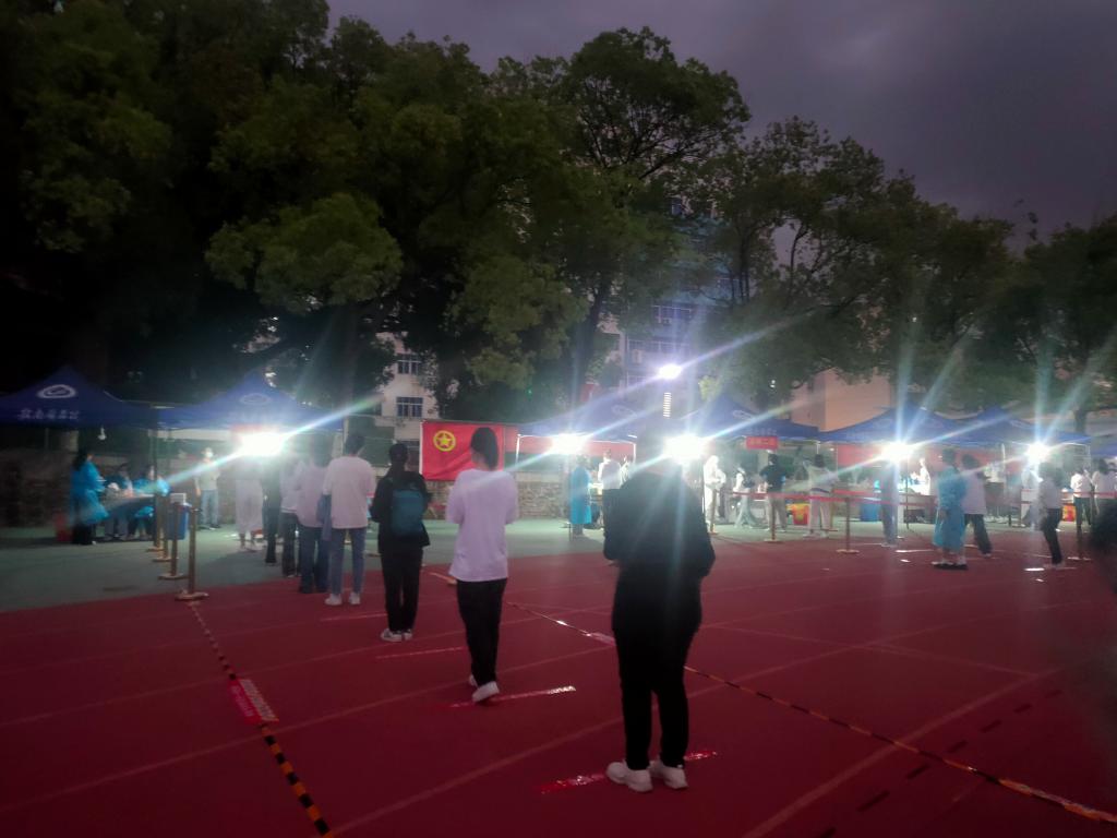 两个校区的采集现场都设在田径运动场,严格按照疫情防控要求,科学设置采集区域,搭建帐篷,拉好警戒线,设置1米线标志,配备口罩、座椅、消毒液等物资,同时安排工作人员、志愿者维持现场秩序。