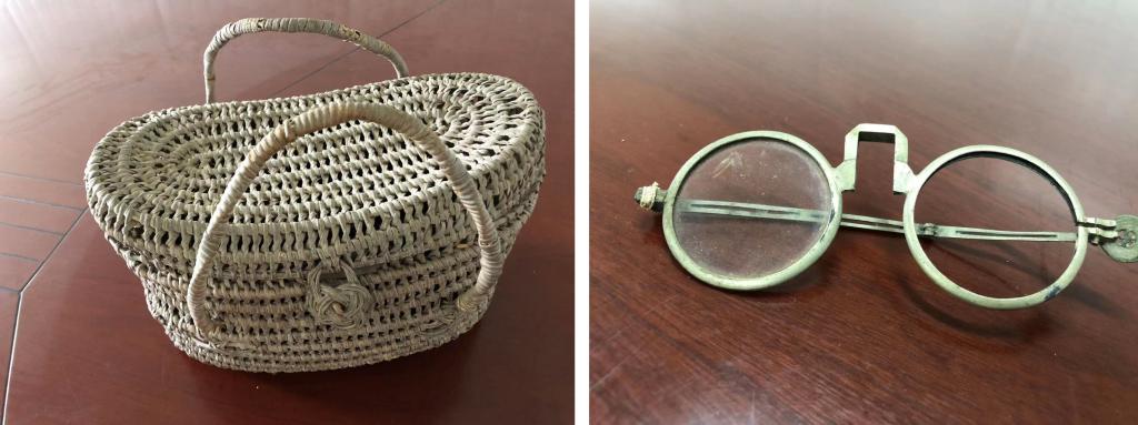 图为谢焕辉使用过的藤编药篮和眼镜。