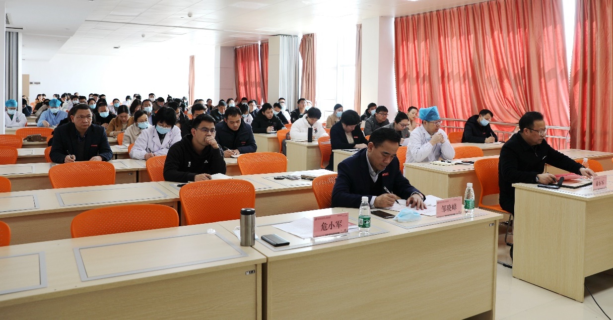 受学校党委副书记、校长兼第一临床医学院党委书记张小康的委托,邹晓峰在会上讲话。邹晓峰表示,全院干部职工一要统一思想、提升认识,切实提升紧迫感和使命感。在更名大学工作面前,没有局外人,人人都是主人翁,全院上下要提高政治站位,把更名大学工作当作目前最紧要的工作任务,配合好学校更名办及相关部门做好迎检准备工作,为决战决胜更名大学而努力奋斗,贡献力量;二要认清形势、抢抓机遇,切实增强更大信心和决心。今天,站在赣医发展的关键节点上,每个赣医人必须增强战必胜、攻必克的信心和决心,抢抓千载难逢的战略机遇,保持敢闯敢干、一往无前的姿态,用汗水浇灌出赣医更加辉煌灿烂的明天。三要明确任务、落实责任,高质量完成相关建设任务。作为全校目前学生体量最大的二级学院,要主动认领工作任务,强化工作分工,加强沟通协作,保质保量完成学校交办的各项工作。要充分利用国检前这段时间进行集中攻坚,倒排工期、加大力度,在国检之前,根据学校部署把各项指标任务、支撑材料及现场考察点准备工作全部完成到位,特别是狠抓“三个文明”建设督查工作,全面做好迎接教育部专家进校考察的各项准备工作。四要凝心聚力、务实奉献,在更名大学工作中担当作为。全院师生员工必须立刻行动起来,进一步树立主人翁意识,强化全院一盘棋思维,维护大局、服从安排,为学校全面建设高水平应用型医科大学贡献智慧和力量。