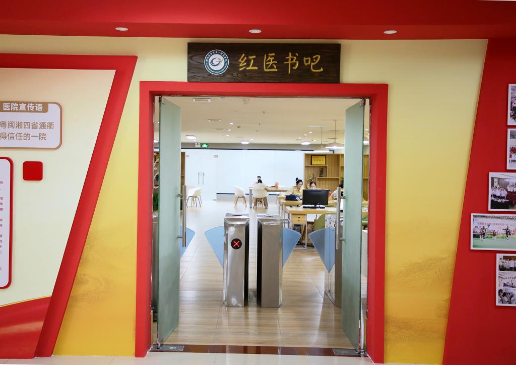 红医书吧位于该院黄金院区门诊大楼二楼,占地面积120余平方米,整体布局分“红医长廊”“红医书屋”“红医茶吧”三大空间板块,凸显党建引领、红医精神、抗疫先锋、白鹭文化、先锋人物等元素,配备有习近平新时代中国特色社会主义思想书刊专门书柜、红色书刊专门书柜,标准化党建活动室、新时代文明实践站等活动区域。