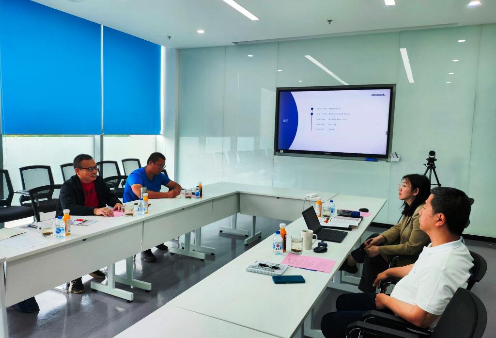 在奥托博克(中国)工业有限公司,温优良一行与奥托博克人力总监齐倩,高级技术专家卢山开展座谈交流。双方还对目前假肢矫形职业体系建设和行业发展方向、行业从业规范等进行了探讨。会后在卢山陪同下参观了假肢装配间、矫形器制作间。