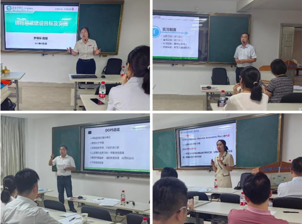 培训主要包含8个主题。国家课程思政名师罗晓婷结合多年的经验,深入讲授了课程思政在教学过程中的融入;周爱琴、朱韵雅、陈路军先后进行了实习管理规范、Mini-CEX、SOAP、DOPS、OSCE等临床教学评价方法主题培训。
