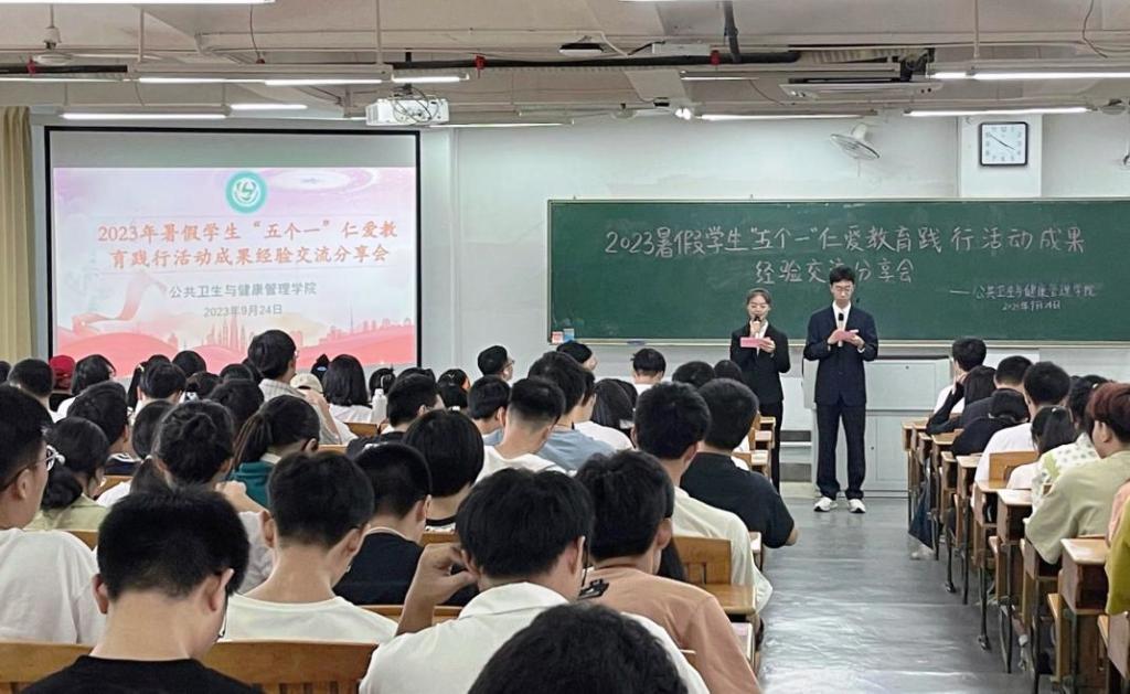 9月24日,公共卫生与健康管理学院在黄金校区举办2023年暑期“五个一”仁爱教育践行活动优秀成果分享交流会。该院学工办全体辅导员、获奖学生代表、2023级新生代表200余人参加。