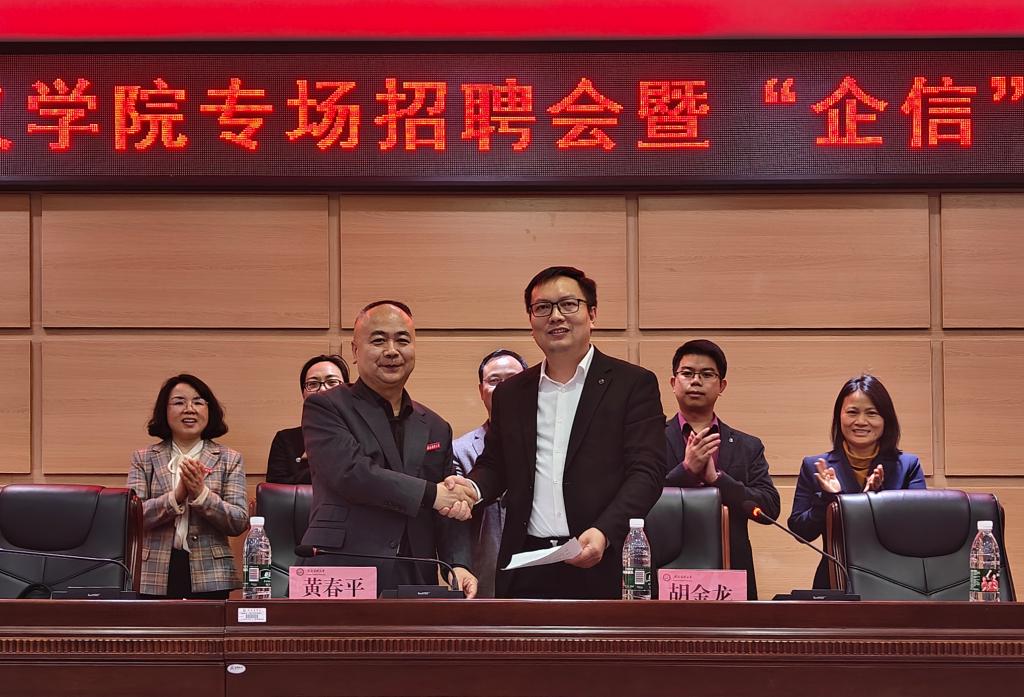 黄春平与胡金龙代表双方进行“企信”奖学金签约。