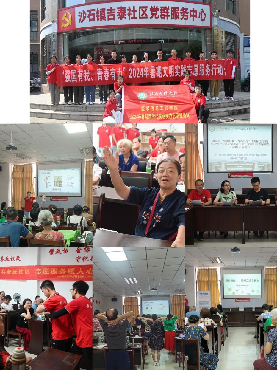 7月11日,医学信息工程学院联合医学技术学院组建“乡”伴同行暑期社会实践队,前往沙石镇吉泰社区开展2024年“强国有我、青春有为”暑期社会实践活动暨“万名大学生进千站”文明实践志愿服务行动,让青年大学生在服务社区的过程中,感受社会的变化与发展,增强社会责任感和历史使命感。