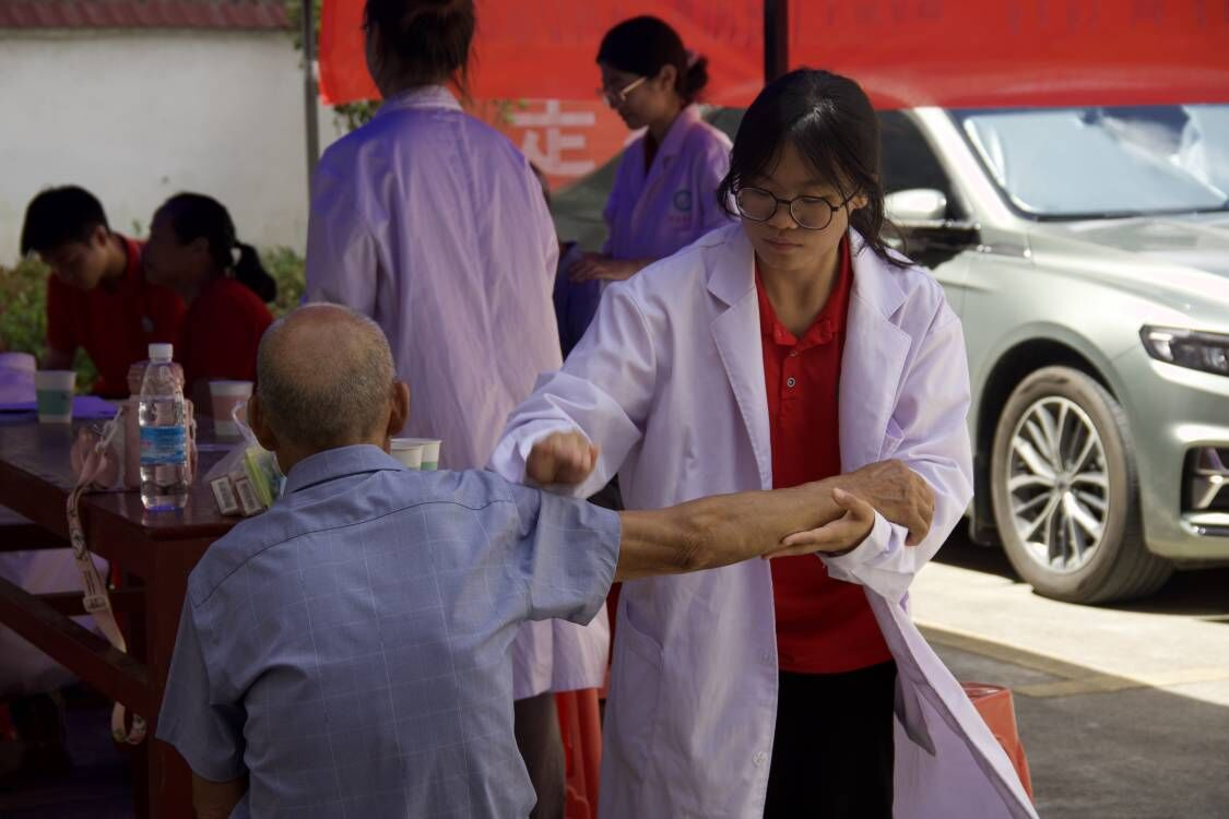 服务零距离,义诊暖人心。为让当地群众能够切身感受中医药文化的魅力,体验中医传统疗法服务,实践队先后前往上堡乡新民社区和圩镇开展中医药文化宣传暨义诊活动。期间,实践队员们结合所学专业知识,为居民进行推拿艾灸、耳穴压豆、肩部刮痧等中医传统疗法服务,供应白刺香薷中药茶饮,发放香包香囊和防暑降温用品。