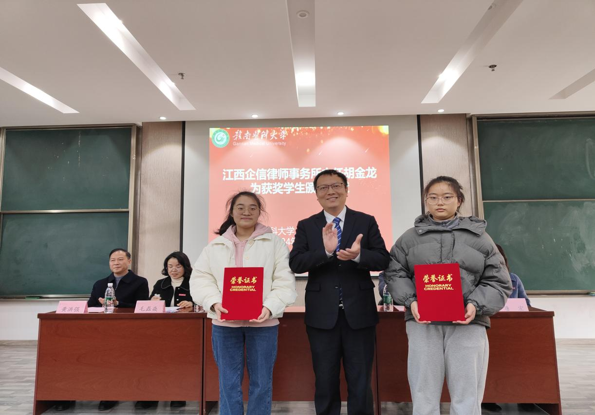 江西企信律师事务所主任胡金龙为获奖学生颁奖并合影留念。