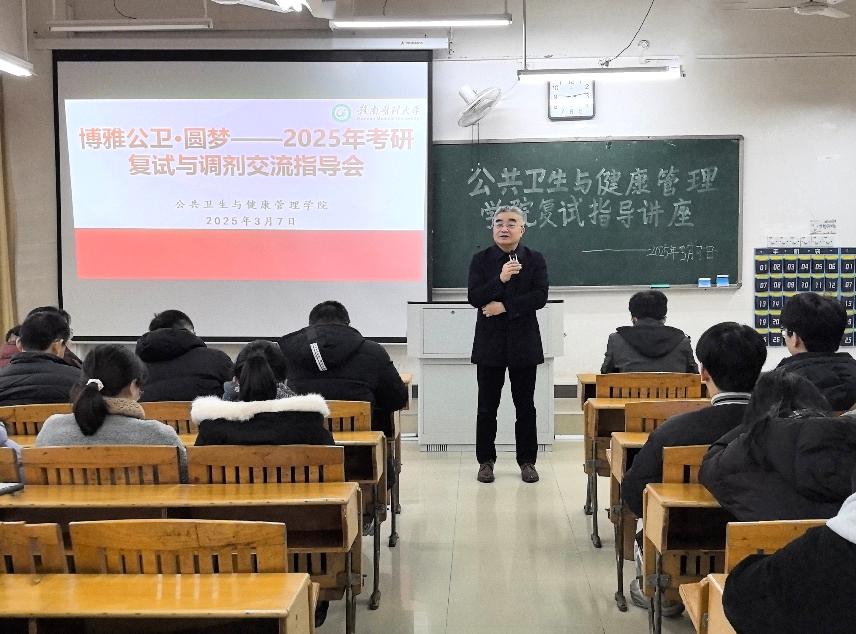 3月7日上午,公共卫生与健康管理学院举办考研复试与调剂交流指导会。学院院长黄诚,学院教工第一党支部教师、学工办辅导员及2025届考研复试同学参加会议。