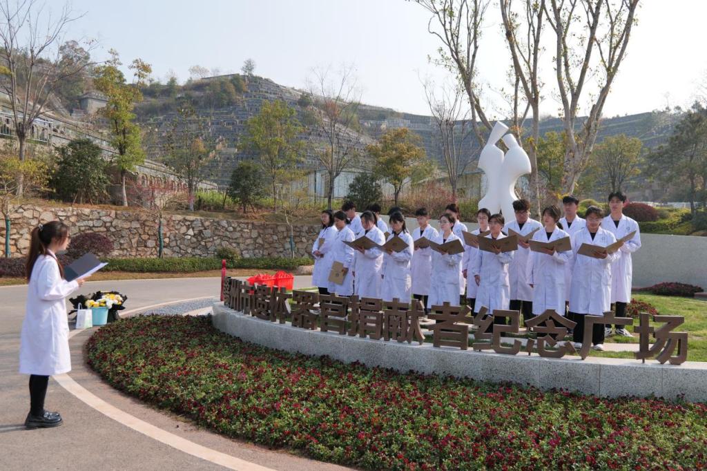 在遗体器官捐献纪念碑前,全体人员集体默哀,师生代表向遗体器官捐献者敬献花束并进行庄重而神圣的大体老师骨灰安葬仪式。随后,基础医学院“生命火炬”公益团队学生代表宣读《人体器官捐献志愿者倡议书》,集体朗诵了诗歌《致敬大体老师感恩辞》。活动最后,参加纪缅怀念活动人员依次敬献鲜花。