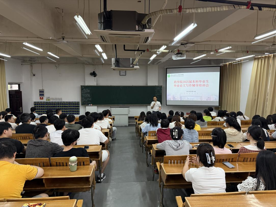 5月14日,药学院举行2025届本科毕业生毕业论文写作辅导培训会,全体本科毕业班同学参加。培训由学院副院长丁冶春主持。