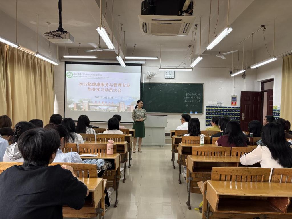 5月27日,公共卫生与健康管理学院召开2022级健康服务与管理专业本科班实习动员大会。该院副院长罗江洪、教研室负责人、专业负责人、学工办负责人及2022级健康服务与管理专业本科班全体学生参加会议。