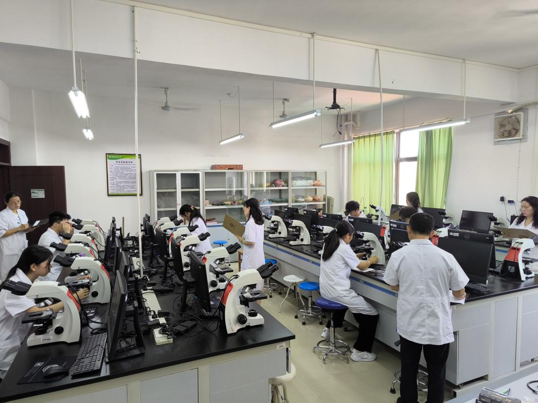 大赛组织严谨有序,经过各班级内部的选拔与推荐,最终共有来自各班的58位学生脱颖而出,齐聚决赛现场,同台竞技。决赛内容紧密围绕专业核心,聚焦显微镜的规范熟练操作与组织学切片的快速准确识别两大能力。赛场上,选手们凝神静气,熟练切换物镜,准调焦精,在镜下识别形态学特征,作出正确判断。