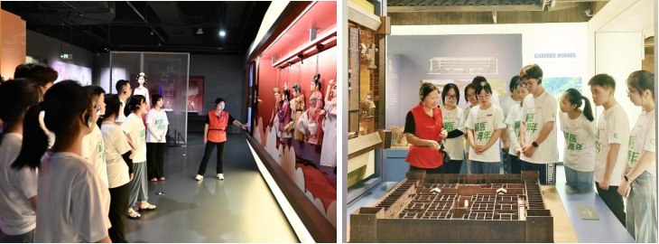 实践队先后来到世界客家民俗文化城、龙南市新时代文明实践中心、栗园围等地考察调研。在宣讲员的引导下,队员们时而驻足聆听、时而动手体验,在体验活动中触摸客家文化根脉。拉动沱江号子的绳索,粗犷雄浑的号子声穿越时空,诉说着客家先民劈波斩浪、拓荒垦殖的奋斗史诗;手手相牵触碰感应屏,悠扬婉转的客家山歌便在耳畔流淌,“唱古说今”的旋律里,藏着客家人以歌言志、以乐抒情的生活智慧;凝视围屋模型,解读夯土技艺、防御体系的建造密码,惊叹于客家人在逆境中求生存、谋发展的生存哲学与协作精神。