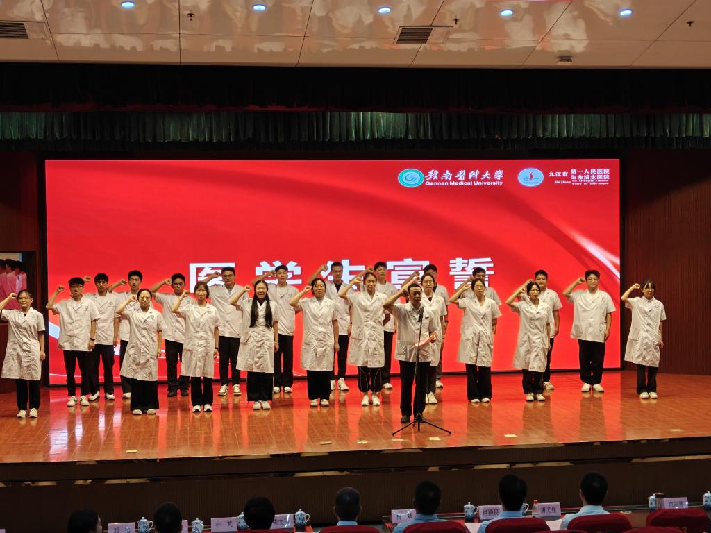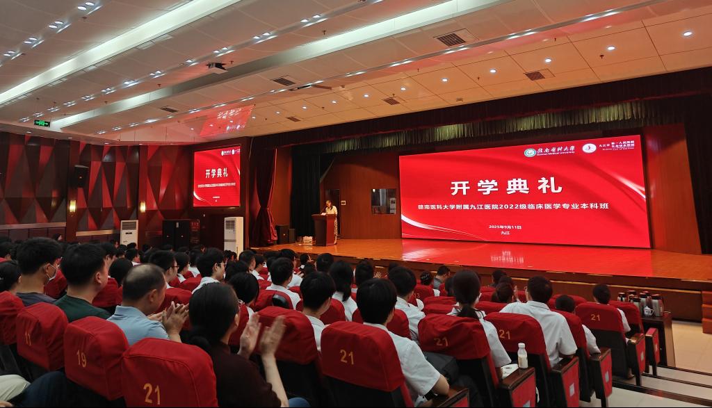 近日,附属九江医院2022级临床医学专业本科班开学典礼在九江市第一人民医院八里湖院区举行。九江市第一人民医院党委副书记、院长唐尤佳,赣南医科大学第一附属医院党委委员、第一临床医学院党委副书记肖殿民,双方单位相关领导、教师代表及2022级临床医学本科班学生齐聚一堂,共同见证同学们开启从理论迈向临床的关键成长阶段。
