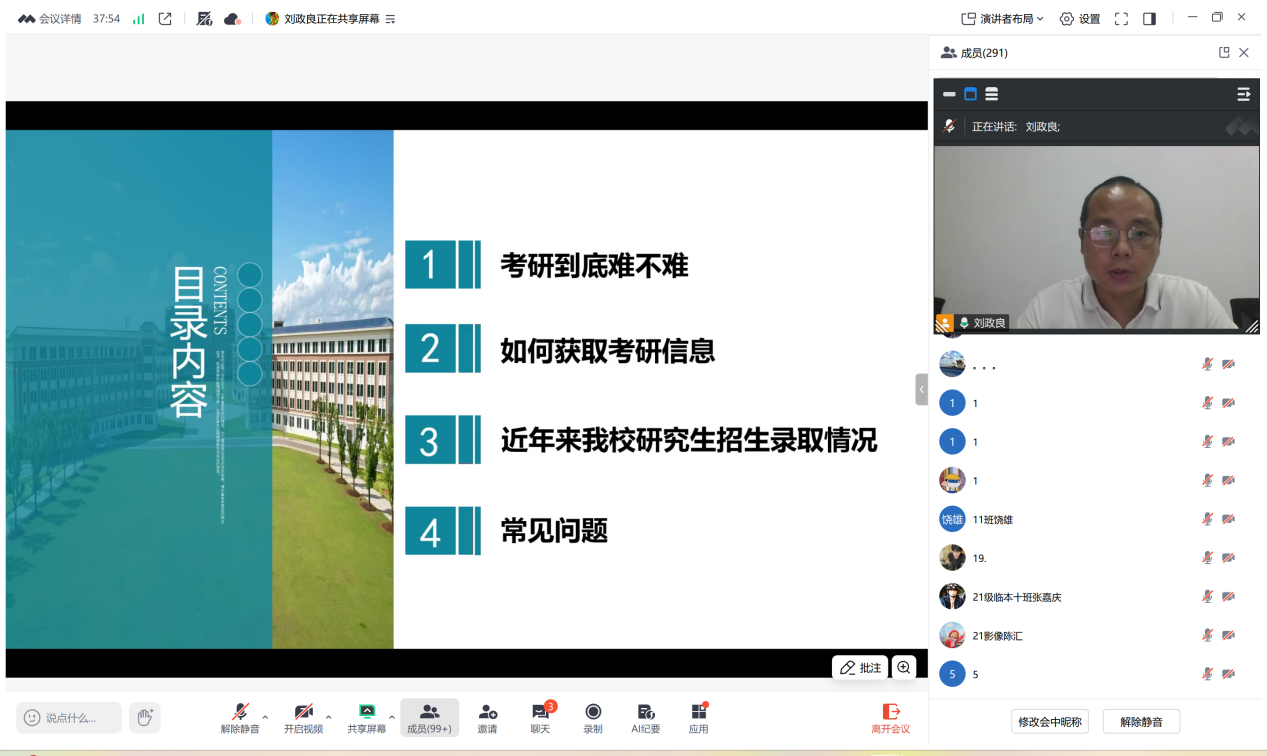为进一步引导我校2026届毕业生了解考研形势,明晰择校报考要求,助力考研学子成功“上岸”,9月28日,研究生工作处联合第一临床医学院举办考研报考指导交流会。研究生工作处副处长曹思、招生办公室刘政良担任主讲,2026届300余名毕业生、家长通过线上方式参与。