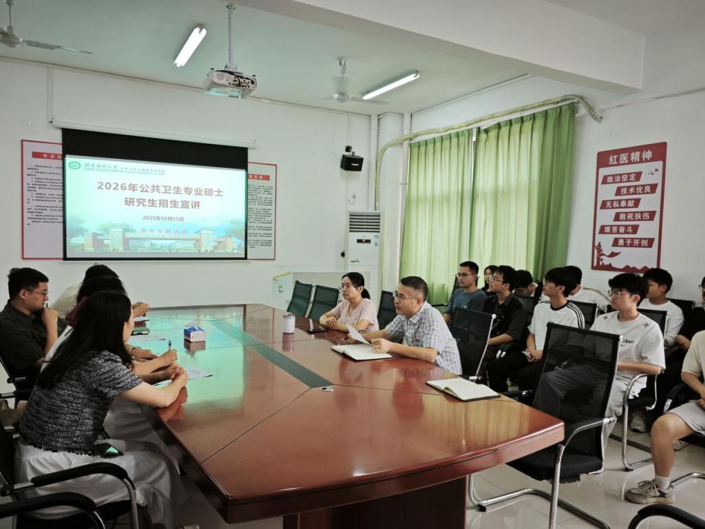 10月15日,公共卫生与健康管理学院在黄金校区举行2026年公共卫生专业硕士研究生招生宣讲会。学院行政负责人胡恭华、副院长高艳芳、学工办副主任、预防医学专业毕业班班主任、研究生新生代表及预防医学专业毕业班学生参加。