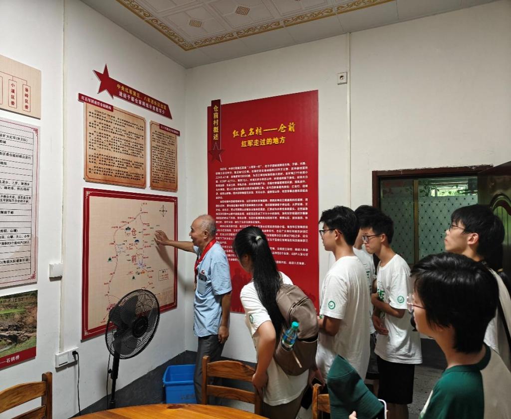 “红医新长征”社会实践团首先参观了仓前村村史展览馆。在这堂生动的“红色微讲堂”中,村中长者杨东成爷爷为同学们详细讲述了1934年红五军团在此地集结休整的革命史实,及79位仓前籍烈士的英勇事迹。当讲到恩子石战斗的悲壮时刻,实践团中一名红色卫生史博物馆的学生讲解员亦情不自禁地与杨爷爷分享了自己所了解的苏区医疗救护体系建设历史,并共同回顾红军如何在物资匮乏中解决“缺医少药”的时代难题。这一场精神对话使队员们更深刻地理解了“信仰”二字的分量,也使作为医学生的我们更坚定了“以民为本、救死扶伤”的职业初心。