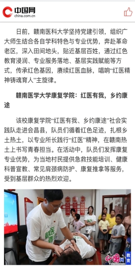 通过红色教育浸润、专业服务落地、基层实践赋能的创新方式,循着红色足迹,扎根赣南红土,以专业所长践行“红医精神”。通过探索“红色文化”与“康复专业”的深度融合,将社会实践转化为一堂“行走的思政课”和“移动的专业课”,将康复服务延伸到老区基层,用康复知识服务人民健康,实现学以致用,唱响“红医精神铸魂育人”主旋律。