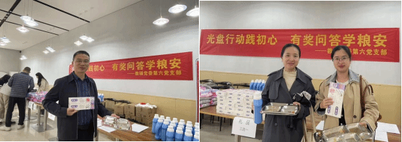 活动当日,职工食堂内的问答互动区早已焕然一新:定制的粮食安全主题海报醒目张贴,各类实用礼品整齐陈列,清晰明了的答题流程公示牌前,不少刚结束用餐的职工驻足观看。在教辅党委第六党支部党员志愿者的热情引导下,职工们有序排队参与答题——现场题目紧扣世界粮食日主题,既涵盖《粮食流通管理条例》等节粮爱粮政策法规,也包含“中国粮食产量占世界比重”等粮食安全核心常识,还融入“合理膳食搭配”等健康饮食科学知识,兼具知识性与趣味性。