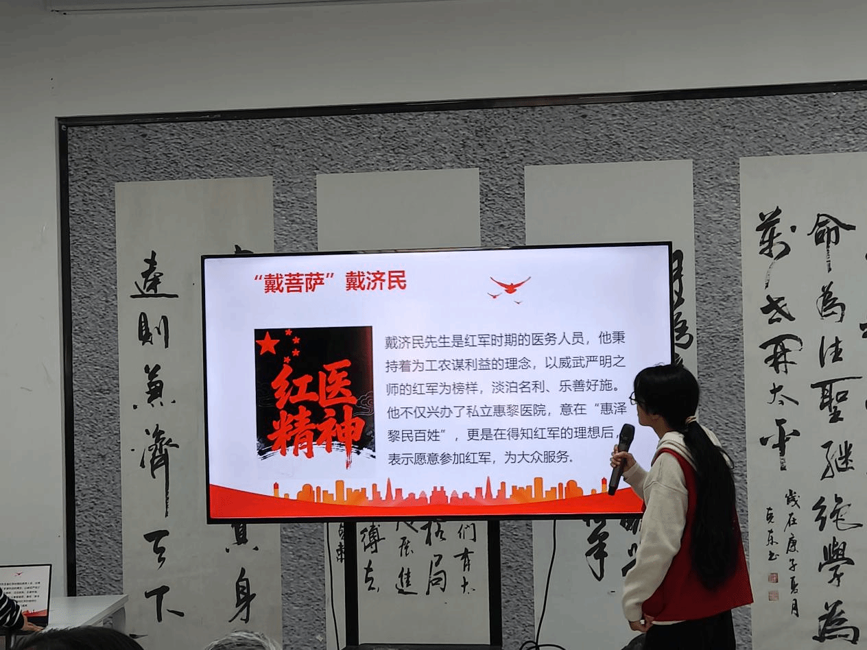 荧幕亮起,随着该院制作的红色动漫《唐义贞:只要一息尚存,定为革命奋斗》播放,所有人的目光都聚焦在画面上,凝视着那位用生命践行革命誓言的巾帼英雄,她的坚定信仰与无畏气魄透过影像直抵人心。此外,志愿者还为长辈讲述“红色华佗”傅连暲、“戴菩萨”戴济民等红医故事,激励着大家在平凡生活中传递温暖与力量。