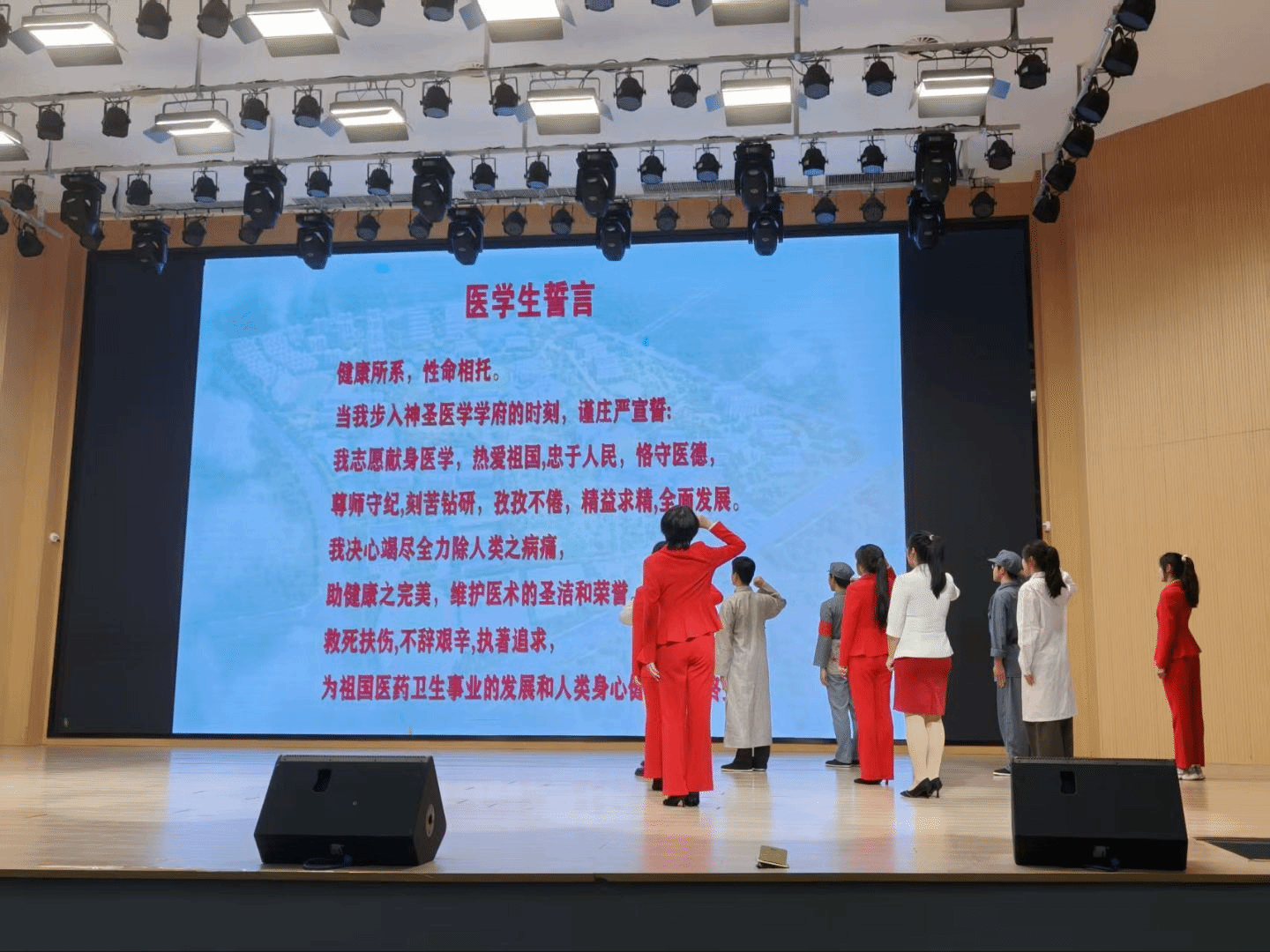 配合着卢婷老师的宣讲,红医精神宣讲小分队相继演绎伍思泉、张子清、李治等红医楷模的革命故事,让红医精神的画卷更加丰满立体。活动最后引导学生开展医学誓言宣誓,誓言铿锵,掷地有声,同学们心潮澎湃,全场同频共振。这是对红医先辈的深切缅怀,更是属于新时代医者的初心回响。