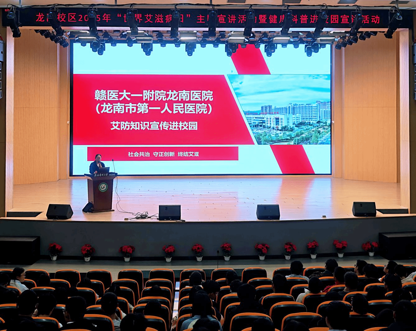 为传承筑牢青年学子健康防线,11月28日,龙南校区联合赣医大一附院龙南医院开展 “世界艾滋病日”主题宣讲暨健康科普进校园活动。赣医大一附院龙南医院感染性疾病科主任廖爱华主讲,龙南校区辅导员,临床医学、生物信息学等专业360余名师生齐聚现场,共学防艾知识、共护健康成长。