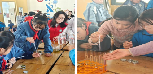 “火山喷发啦!”随着泡腾片投入装有食用油和色素水的容器,气泡裹挟着红色“岩浆”冲破油层,孩子们的欢呼声瞬间沸腾。“红药匠”志愿者助“火山喷发”实验,深入浅出地讲解了物质反应、密度差异等科学原理,引导孩子们联想到碳酸饮料冒泡、煮汤时油层漂浮等生活现象,让他们懂得“科学就在身边”。