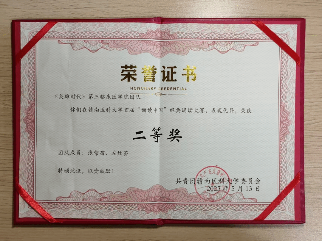 除了专业学习与志愿服务,张紫苗亦注重全面发展,在多元实践中锤炼综合素养。大一时,她加入校广播站成为一名播音员,用声音传递校园正能量;在“读中国”经典诵读大赛中,她以饱满的情感诵读红色经典《英雄时代》,荣获二等奖,让红色文化在朗朗声中浸润人心。这些经历不仅丰富了她的校园生活,更让她在表达与传播中学会用更温暖的方式传递医者情怀,为未来更好地服务患者、沟通群众积累了经验。