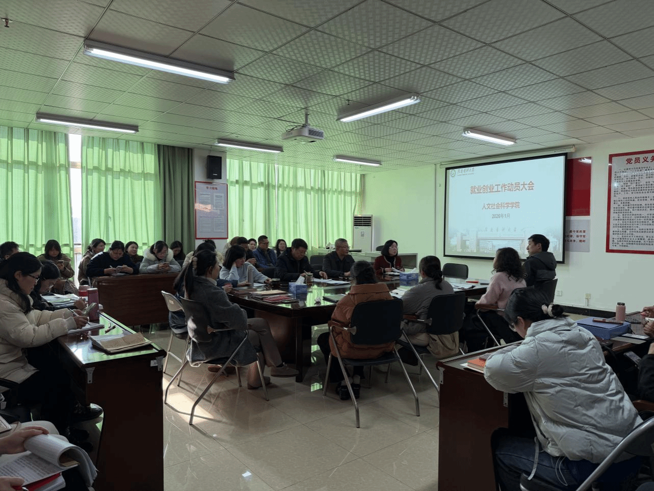 1月9日下午,人文社会科学学院在蓉江校区召开就业创业工作动员大会。学院党政领导班子及全体教职工参加会议,会议由该院党委副书记毛磊焱主持并作工作汇报。