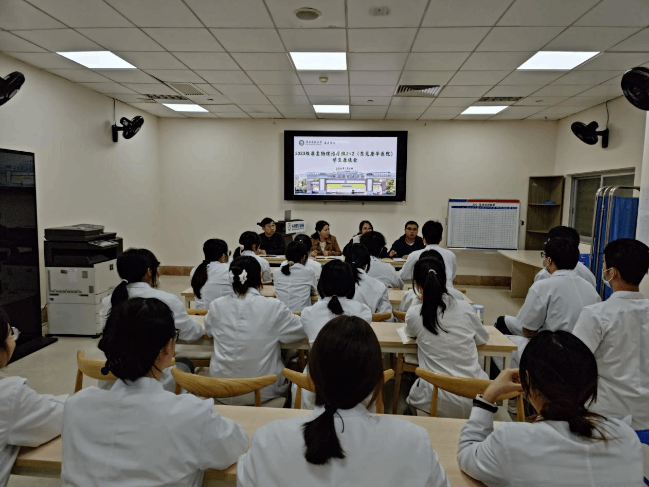 在广州市红十字会医院,叶贞丽一行在医院康复科主任牟志伟陪同下参观了科室病区和康复治疗学“2+2”创新型培养学生教学场所,看望了在此进行培养的学生。在座谈会上,医院副院长宁波详细介绍了医院发展情况、优势学科和历史沿革,听取了康复科主任牟志伟关于康复治疗学“2+2”创新型培养教学开展情况、学生学习成效等方面的介绍。叶贞丽介绍了此次进行同质化检查的意义、对于康复治疗学“2+2”创新型培养学生成长的后续安排和学院医康养融合应用型人才培养成果。双方还就人才培养和学生实习实践开展进行交流。会后,还进行了实践教学基地揭牌仪式。