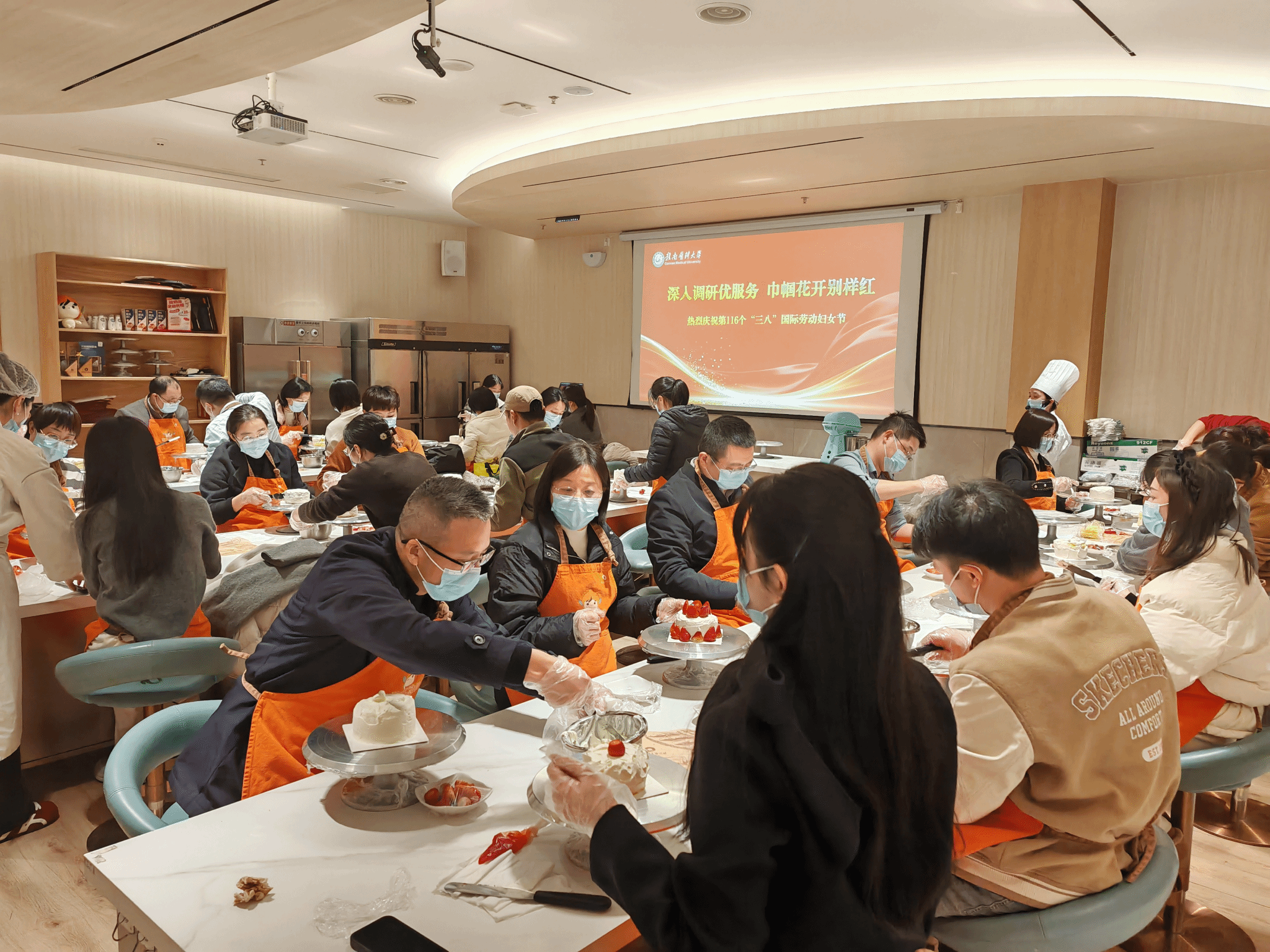 实地考察结束后,烘焙师现场指导大家亲手制作属于自己的节日蛋糕。抹胚、裱花、装饰……平日里忙于工作的工会干部们,此刻专注投入、笑语盈盈,一个个造型别致的蛋糕陆续出炉,大家手捧自己的“作品”,用一种特别的方式共同庆祝“三八”国际劳动妇女节。