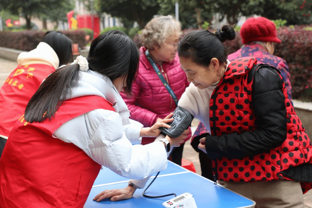 活动现场,医学专业志愿者们化身健康守护者,为社区老人提供免费血压测量服务。大家耐心为每位老人细致检测,认真记录血压数据,针对不同老人的身体状况,逐一讲解日常饮食、作息调理、慢病防控等实用健康知识,叮嘱老人按时服药、定期监测,用专业的医学知识为老人们的身体健康保驾护航,让“无私奉献、救死扶伤”的红医精神在义诊中落地生根。