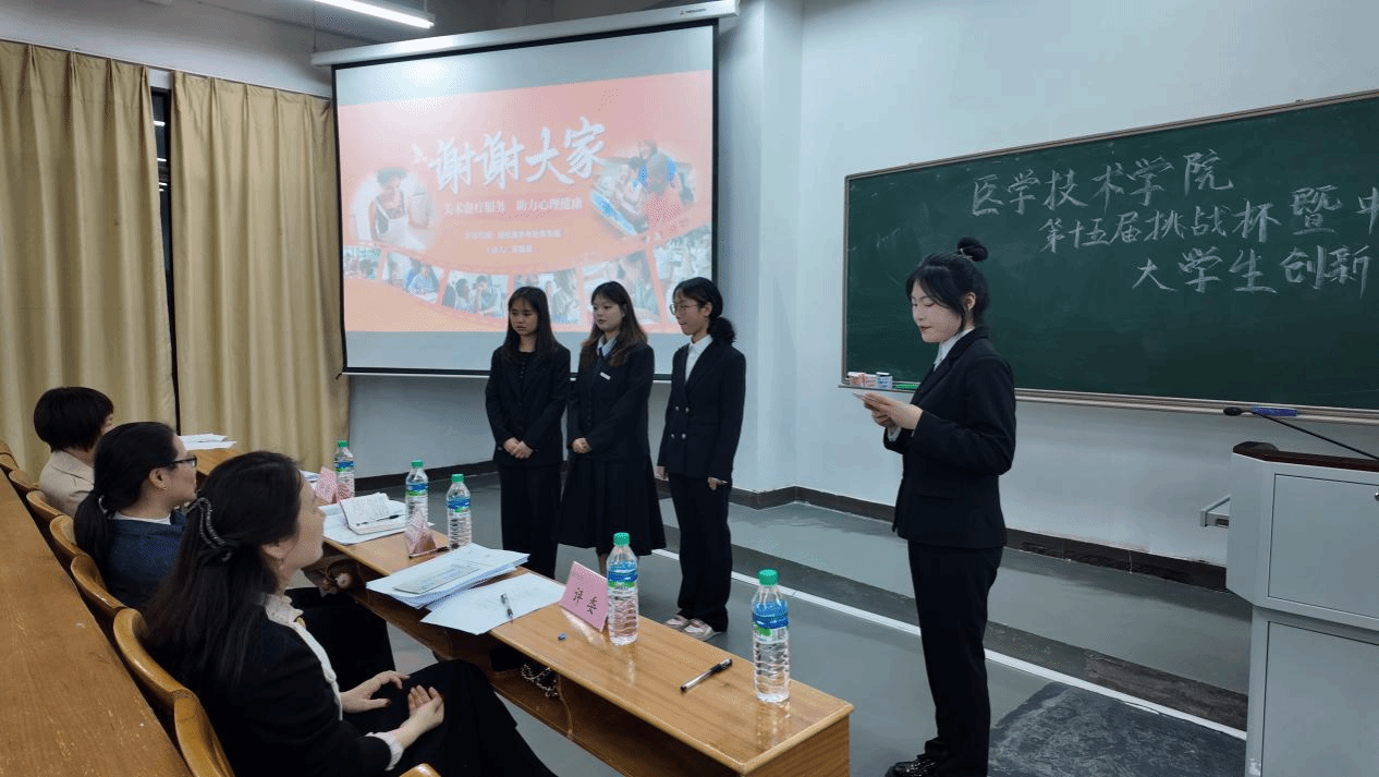 比赛过程中,各参赛团队以PPT路演为载体,围绕项目概况、项目背景、市场分析、技术创新点、商业运营模式等核心内容展开细致讲解,展示过程中思路清晰、表达流畅,充分展现了医学技术学院学子的创新思考与实践能力。进入答辩环节后,评委们聚焦项目的科学设计、创新价值、临床落地潜力和市场转化前景等问题展开深度提问。参赛选手从容应答、逻辑清晰,展现出良好的临场应变能力与专业素养。