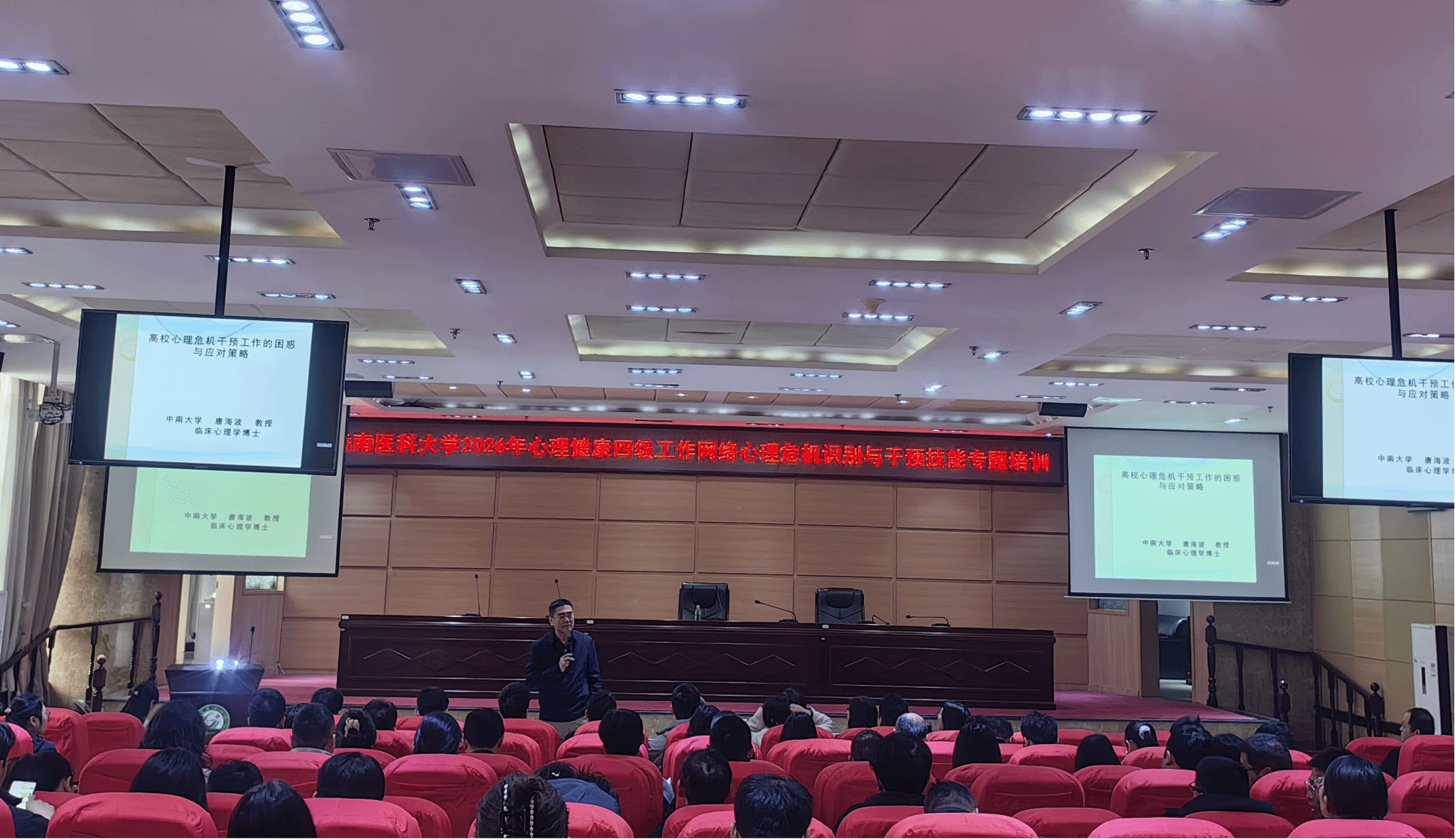 3月21-22日,我校在蓉江校区开展2026年心理健康教育四级网络队伍心理危机识别与干预专题培训,特邀中南大学唐海波教授主讲。学生工作部(处)部(处)长钟秋明出席并讲话,各学院分管学生工作领导、全体辅导员、班主任约200人参加培训。