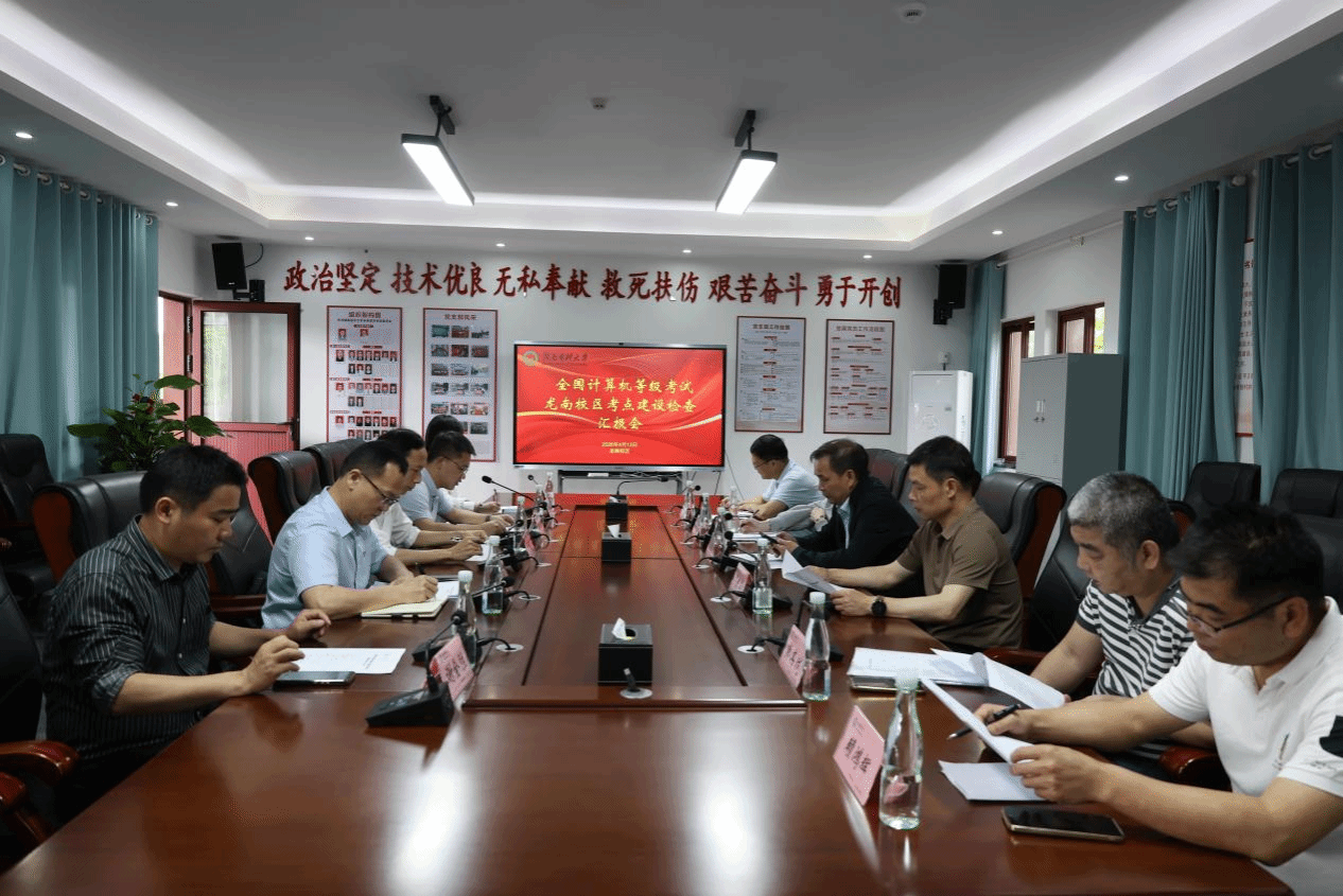 在龙南校区考点建设检查汇报会上,唐志贤介绍了龙南校区的办学概况及承接全国计算机等级考试的基础条件。丁冶春围绕考点建设情况作了专题汇报,详细介绍了人员框架、考场设置、软硬件配置、考务培训、学生组织等方面的工作。