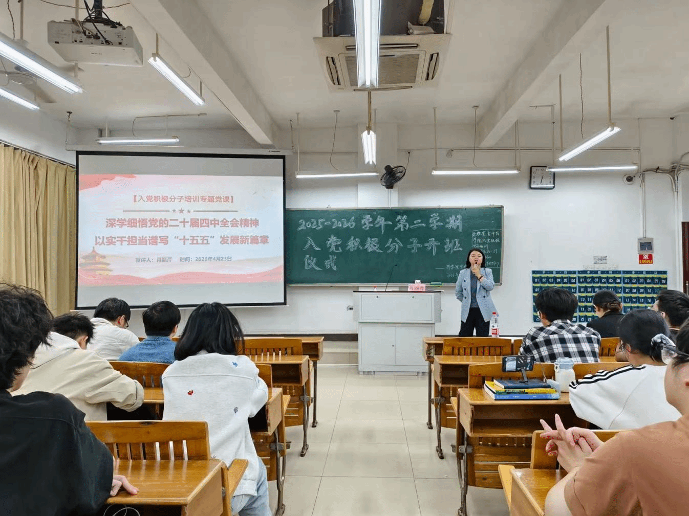 4月23日,药学院联合第三临床医学院、人文社会科学学院举行2025—2026学年学习贯彻党的二十届四中全会精神第二学期入党积极分子培训开班仪式暨培训第一讲。学院党委副书记肖丽芹、各学院学生党支部书记及200余名入党积极分子参会。
