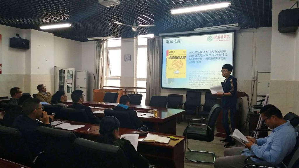 会议分两个阶段进行。第一阶段为沙龙式讨论,以科研创新为主题,牛衍龙博士首先介绍、讲解阿尔茨海默症(老年性痴呆、AD)患者的运动疗法,引出以运动方式作为研究切入点,参会代表纷纷发言,就研究方向、科研团队组建等问题展开热烈讨论。第二阶段为流水式汇报,以学科建设为主题,就培养目标、教学进度等情况进行汇报交流,进一步规范学科建设及教学秩序。